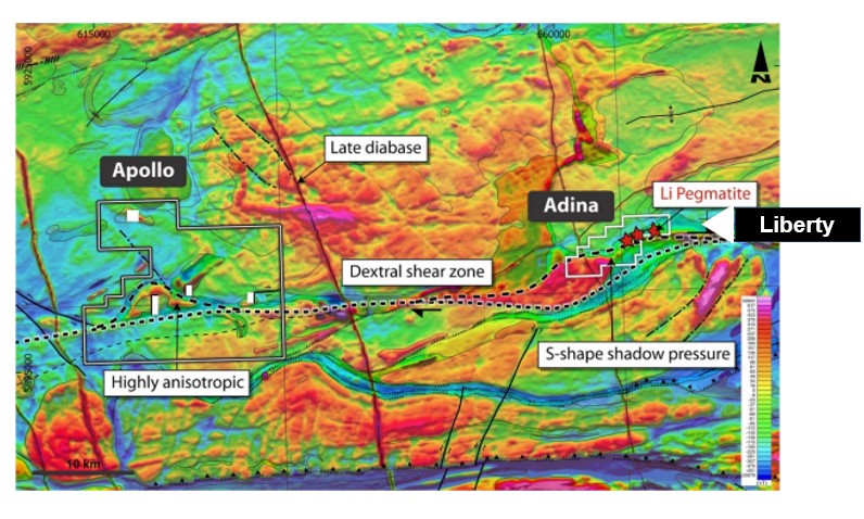 The regional geophysics analysis suggests there is a possibility a significant east-west trending fault corridor/shear feature exists that extends from the Adina Lithium project to the east, passing through Liberty. This corridor/shear feature could control potential spodumene mineralisation. That’s where the first drill holes potentially need to go.